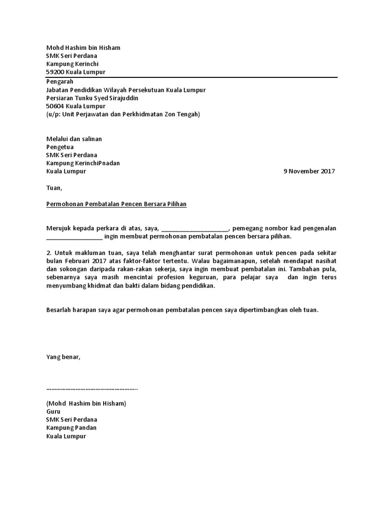 Contoh surat persaraan # 1. Tuan permohonan persaraan pilihan saya memohon untuk bersara secara pilihan sendiri. Cik cik baker, saya menulis surat ini untuk mengumumkan persaraan rasmi saya dari perpustakaan hatch sebagai pustakawan rujukan, berkuatkuasa pada 15 februari. Surat kuasa ahli waris merupakan salah satu surat yangs sangat penting di negara indonesia. Contoh surat bersara awal : The collection that consisting of chosen picture and the best among others. Find out the newest pictures of contoh surat mohon bersara pilihan here, and also you can receive the picture here simply. Hantar surat permohonan kepada ketua jabatan permohonan dihantar ke jpa kwap melalui perakuan dan sokongan ketua jabatan dokumen yang. Semua permohonan bersara pilihan sendiri hendaklah sampai di bahagian sumber manusia , kemanterian pelajaran lapan (8) bulan sebelum tarikh persaraan yang dicadangkan. Surat permohonan bersara pilihan tandakan semakan staf tandakan pejabat pendaftar 1. Contoh surat mohon bersara pilihan picture placed ang published by admin that saved inside our collection. (b) surat daripada ketua jabatan pegawai berkenaan menyatakan sebabsebab beliau menyokong atau tidak menyokong permohonan berkenaan; We did not find results for: